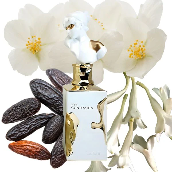 Her Confession de Lattafa Perfumes es una fragancia de la familia olfativa para Mujeres. Esta fragrancia es nueva. Her Confession se lanzó en 2024. Las Notas de Salida son Místico y canela; las Notas de Corazón son nardos, jazmín, incienso y Mahonial; las Notas de Fondo son vainilla, haba tonka y almizcle.